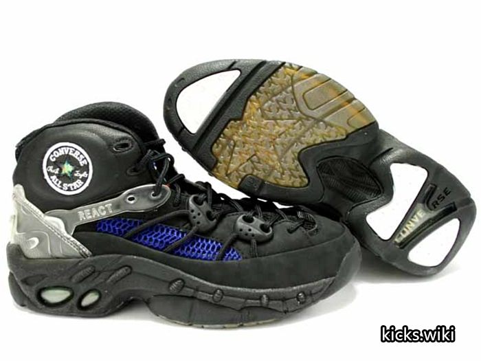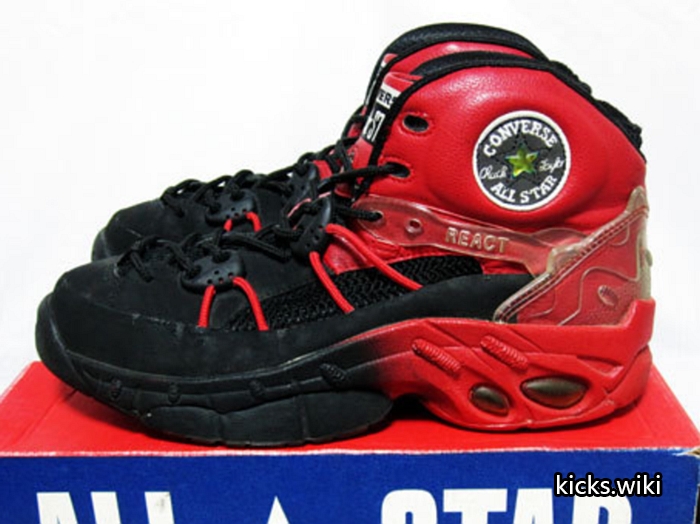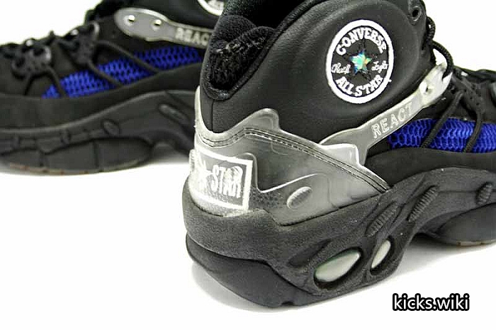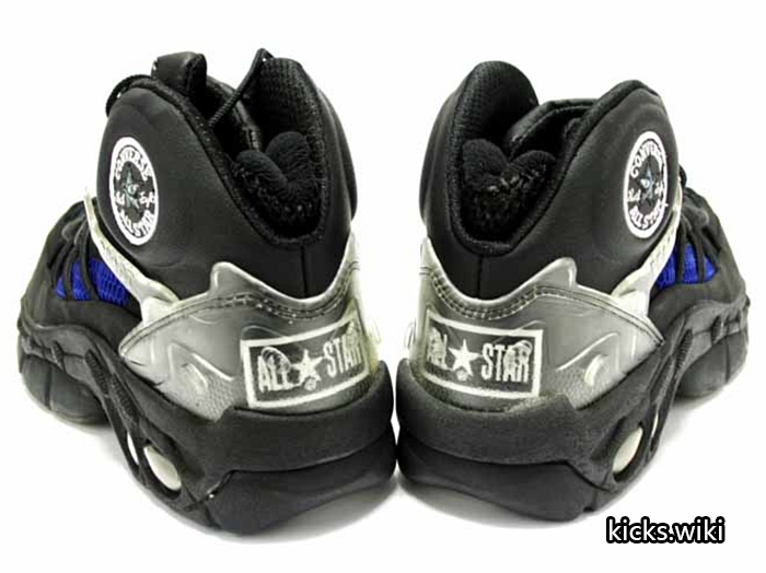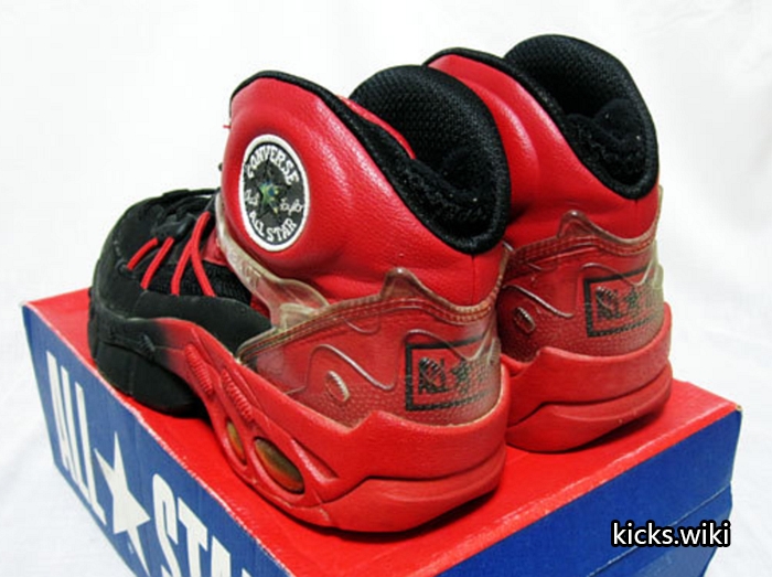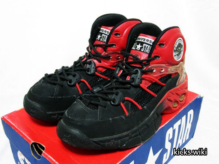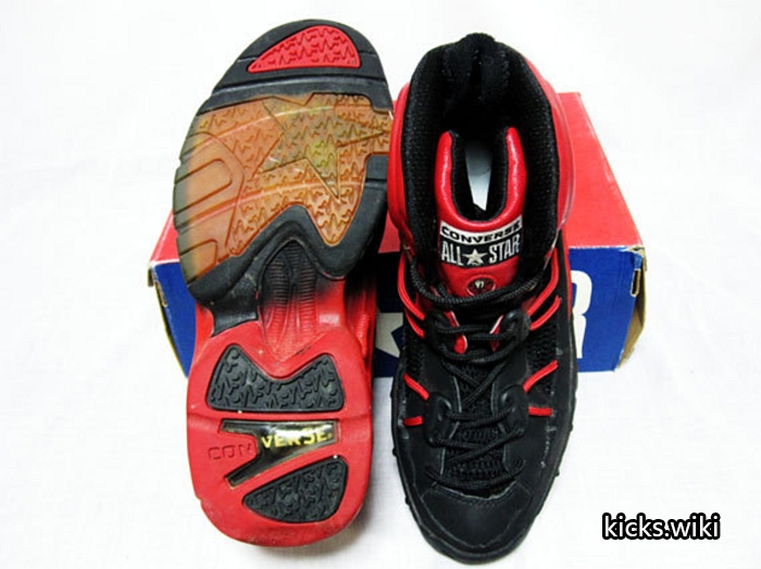 converse all star vibe,1997年的罗德曼衍生款篮球鞋,当年国内发售价780。97-98年间,匡威借由罗德曼的市场号召力,推出过一系列罗德曼的衍生款球鞋。这双罗爷并未真正上脚的球鞋,被国内代理商宝元宣传为罗德曼三代。鞋面使用磨砂皮革和人造揉皮拼接而成,搭配透气的大网眼布。PU聚氨酯中底,后掌使用REACT二代凝胶缓震系统,后跟外置TPU支撑结构。中底上还刻画了类似弹簧的细节,粗犷的外形设计体现了一种机械化风格,国内鞋友也称其为“机械脚”。all star vibe发售时间介于all star 91和all star rodman两款正代签名款之间,从拼色设计风格和鞋舌上太阳花logo的细节上看,更像是all star 91的衍生版本。