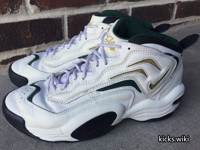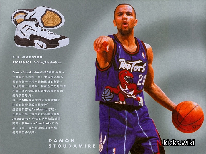 air maestro 96(130595),1996年的中端款篮球鞋,maestro系列的第三代。全皮质鞋面,尼龙织物鞋舌,全长phylon中底,后掌内置air sole气垫,中掌外置TPU支撑。鞋身和外底的诸多细节都有参考air penny II的设计,后掌气垫的形态有些类似air go lwp,只在鞋底有可视化的部分。当时的主力代言人是小飞鼠斯塔达迈尔,另外皮二哥也曾短暂使用过,其他的使用者大多是后卫和小前锋,包括中投王、史蒂夫.科尔、手套佩顿、小甲虫哈达威、斯托克顿、里奇蒙德、道格.克里斯蒂、特拉维斯.贝斯特等等。当然,必须提及的一个就是罗爷,这是他在跳槽匡威之前最后使用过的nike鞋款。