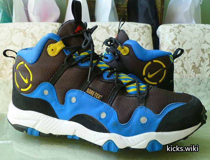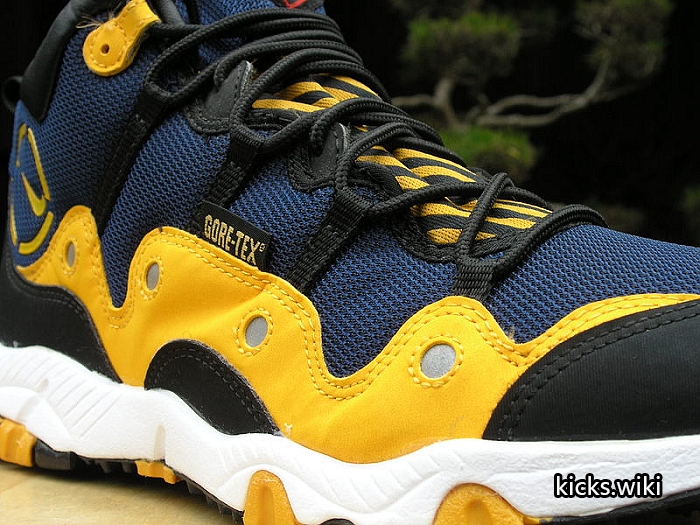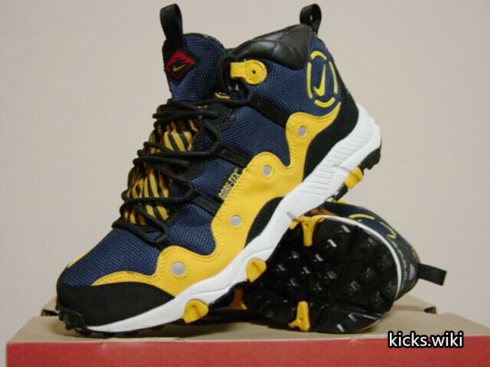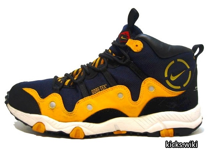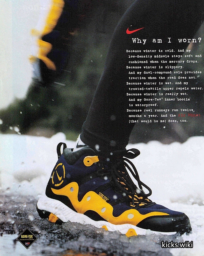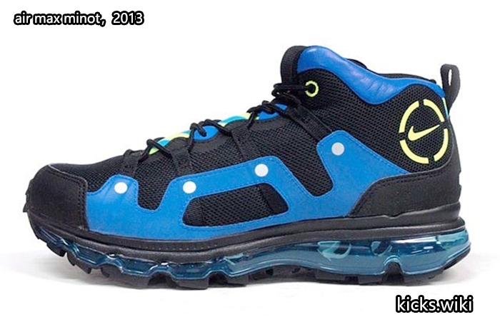 air minot(104100),1997年的越野跑鞋,出自ACG产品设计大师Peter Fogg彼得.福柯之手。当年的minot并不算是ACG系列,而是归属在trail越野系列,该系列都带有一个曲径通幽的菱形标志。minot这款鞋发布于GORE-TEX面料风靡街头、人们渴望技术型服装与鞋履的时期,其丰富的功能使其在街头脱颖而出。防水处理的尼龙织物鞋面搭配GORE-TEX半掌内靴。全长phylon中底,前掌内置zoom气垫,后掌内置air sole气垫。外底使用BRS1000碳纤维耐磨橡胶。minot设计灵感来自诸多元素,例如道路标识,因此鞋舌和后跟带有类似危险警示的条纹图案。minot专为硬核越野跑者设计,也同样适合背包客穿梭城市街道。佩顿曾在平媒中为此鞋代言,搭配一身ACG冲锋衣装扮非常到位。2013年曾推出修改中底的复刻版air max minot。