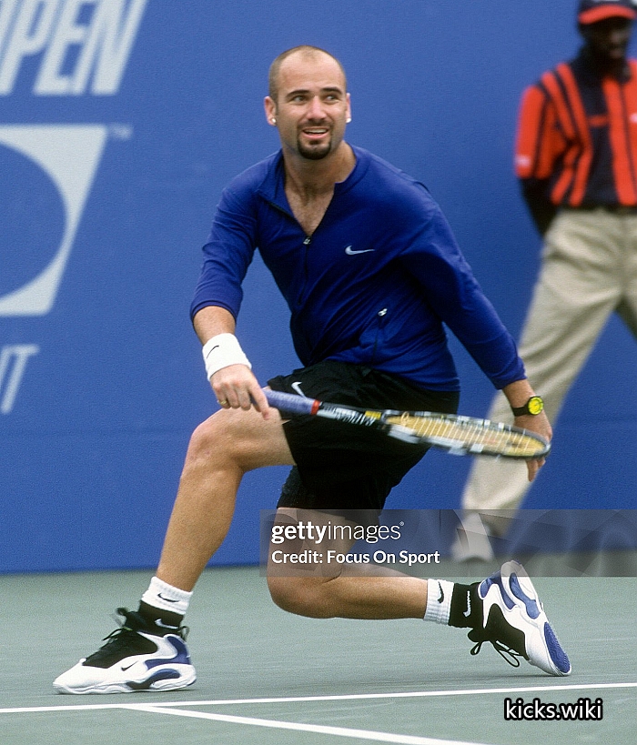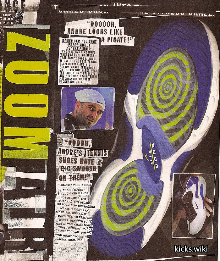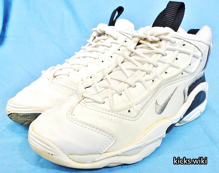 air zoom challenge(140087),1996年Andre Agassi安德烈.阿加西的网球鞋。1988至2004年间阿加西共代言过21款耐克的网球鞋,按时间排序zoom challenge排在第11位。全皮质鞋面,鞋头带有网球鞋特有的补强设计。全长phylon中底,内置全长zoom气垫,中底外置TPU承托,DRC强耐磨外底橡胶。后跟带有阿加西字母A的个人logo。zoom challenge和96年的篮球鞋zoom flight 96、橄榄球训练鞋zoom turf 96有着异曲同工的设计。同一设计理念下诞生的不同产品线的产品,也是这双鞋子的玩味所在。