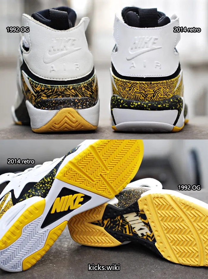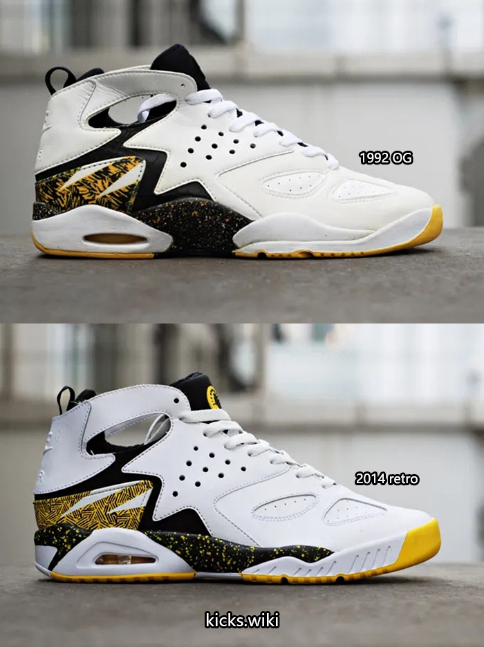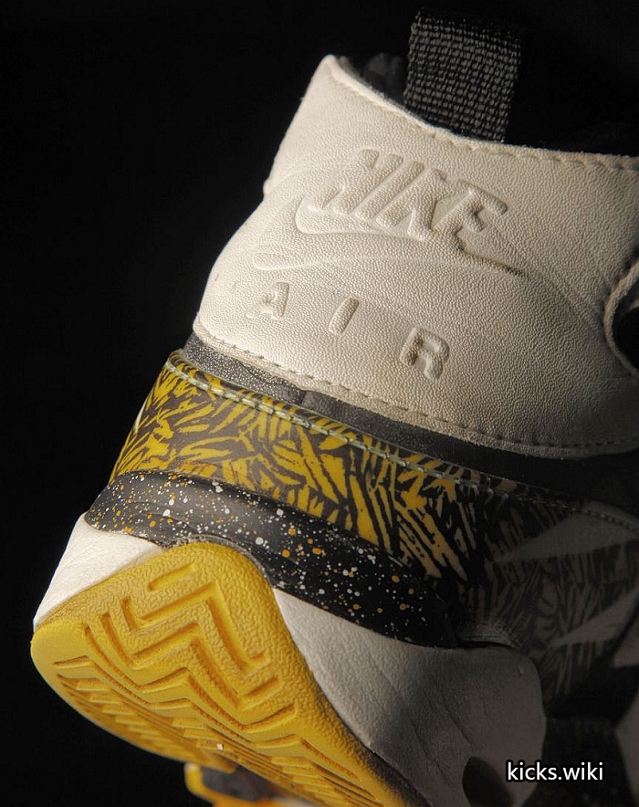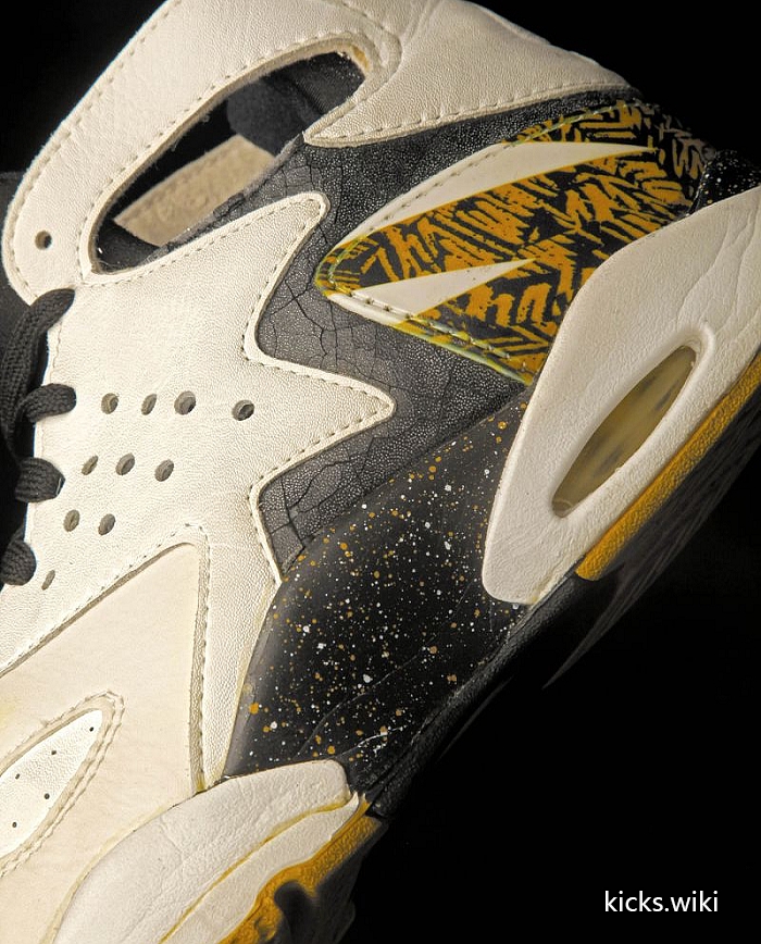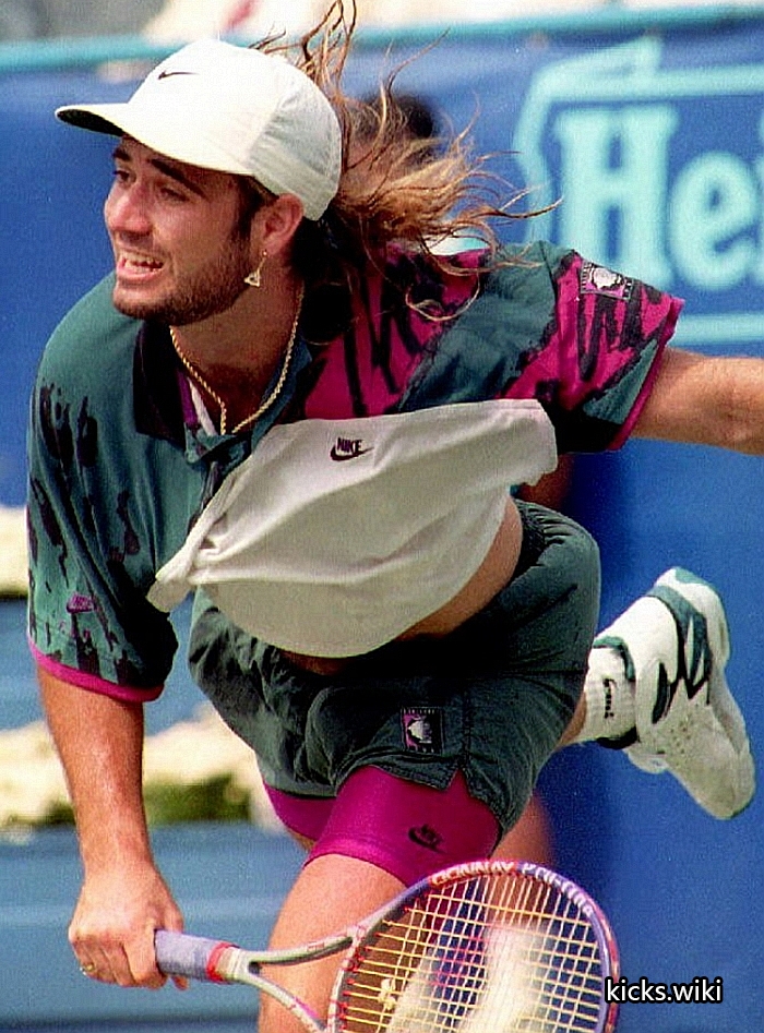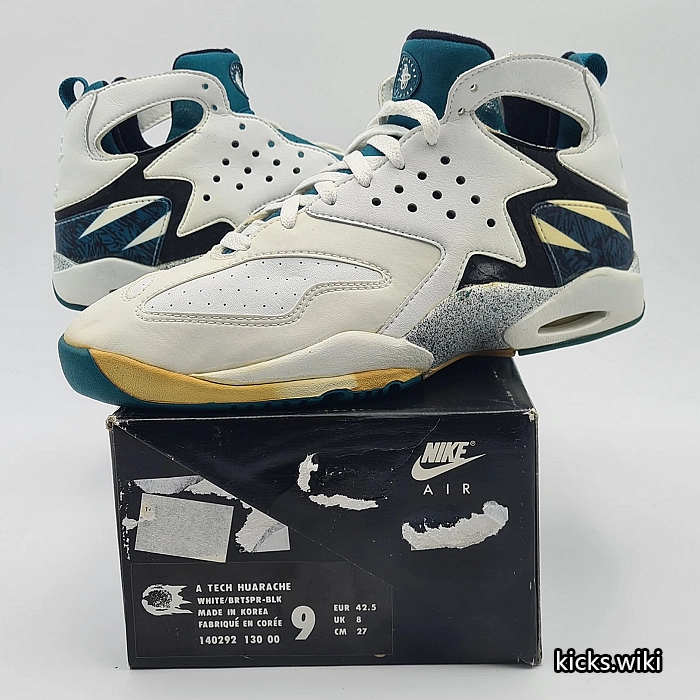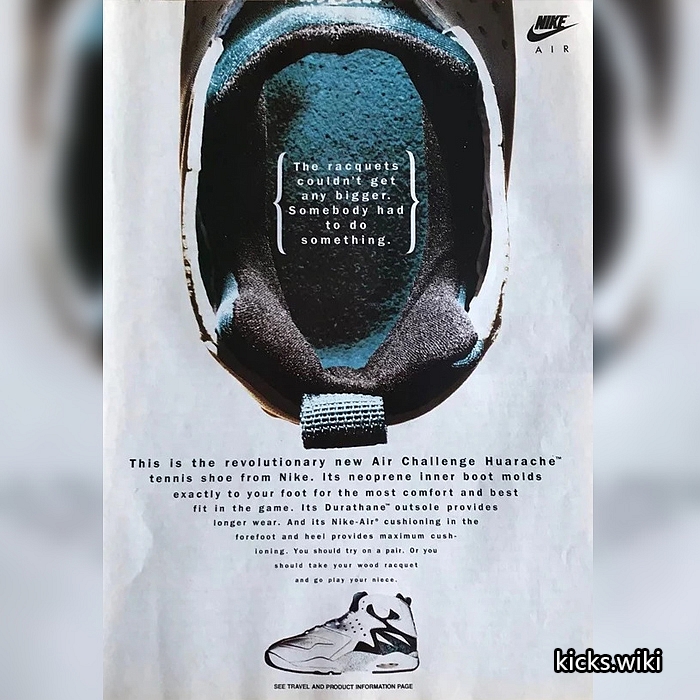 air tech challenge huarache,1992年的网球鞋,Andre Agassi安德烈.阿加西的专属款式。1988至2004年间阿加西共代言过21款耐克的网球鞋,按时间排序air tech challenge huarache排在第6款。challenge huarache是在92年huarache理念下诞生的网球产品,整体思路和同年的aj7相近。皮质和麂皮材料鞋面,全长phylon中底,前掌内置air sole气垫,后掌可视air sole气垫,huarache内靴,脚踝镂空。2014年阿加西重新签约耐克,此双网球鞋在问世22年后终于得到首次复刻。此次复刻的版本修改了元年外底和中底的设计,套用了air tech challenge III和IV的中底和外底。