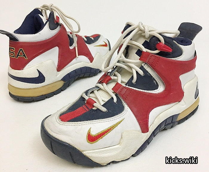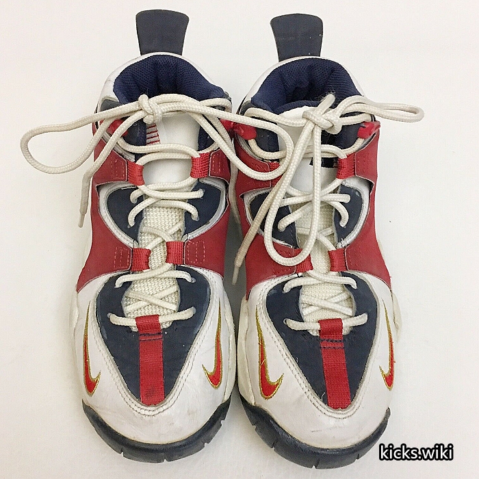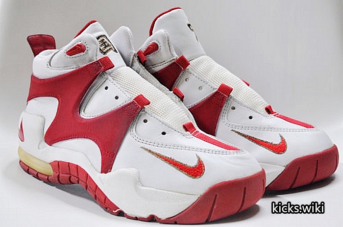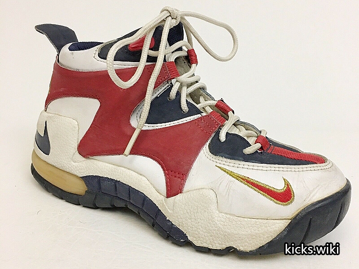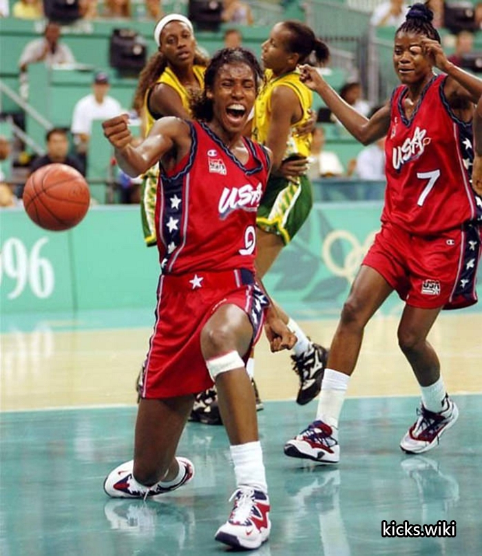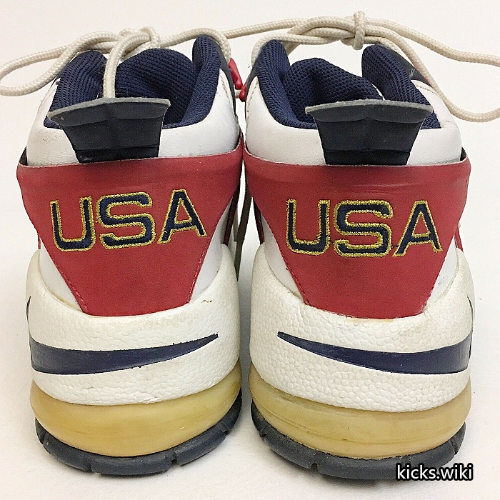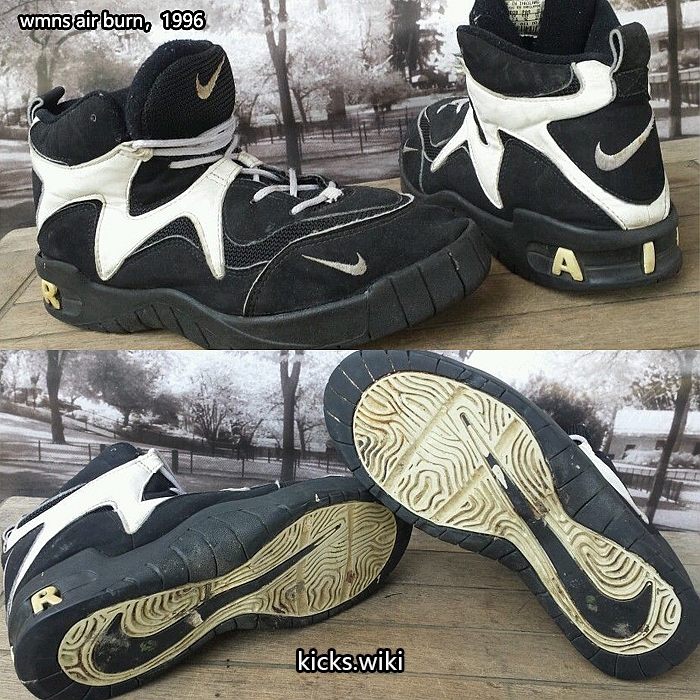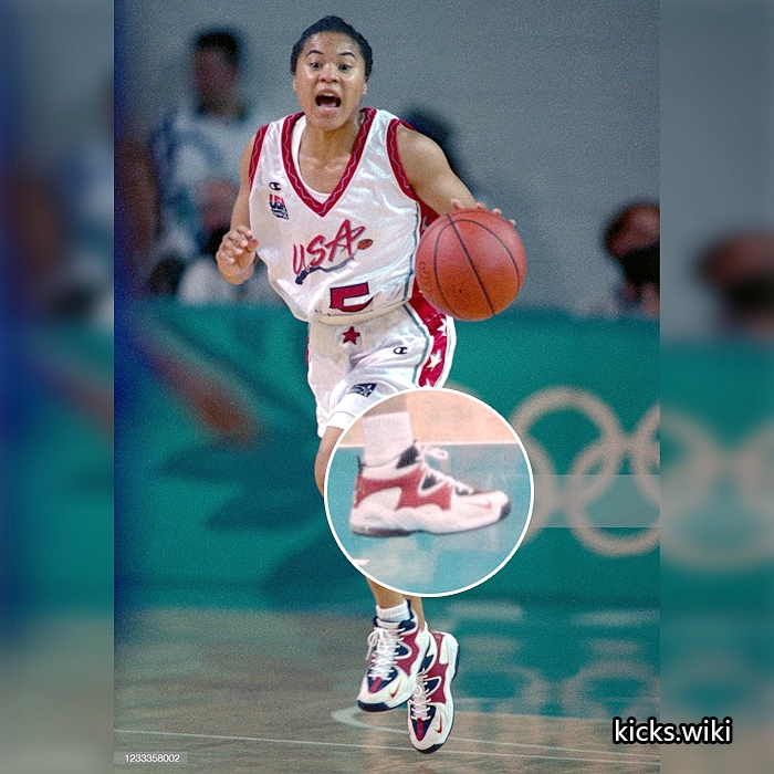 wmns air rupt(131033),1996年的女子篮球鞋,配置后掌双气室max气垫。这款鞋在96年亚特兰大奥运会上大放异彩,美国女篮的主要使用者是Lisa Leslie丽萨.莱斯利和Dawn Staley达恩.斯塔丽,美国队的PE版本鞋舌和后跟绣有国旗和USA的字样。当时中国女篮也使用了这款鞋,遗憾的是国内未发售,鞋舌上刺绣中国二字的国家队PE版本也成为了稀有珍品。wmns air rupt同年还有一款低端简版,wmns air burn(131032),同样是鞋身上使用M型的支撑结构,减配为后掌内置air sole气垫。